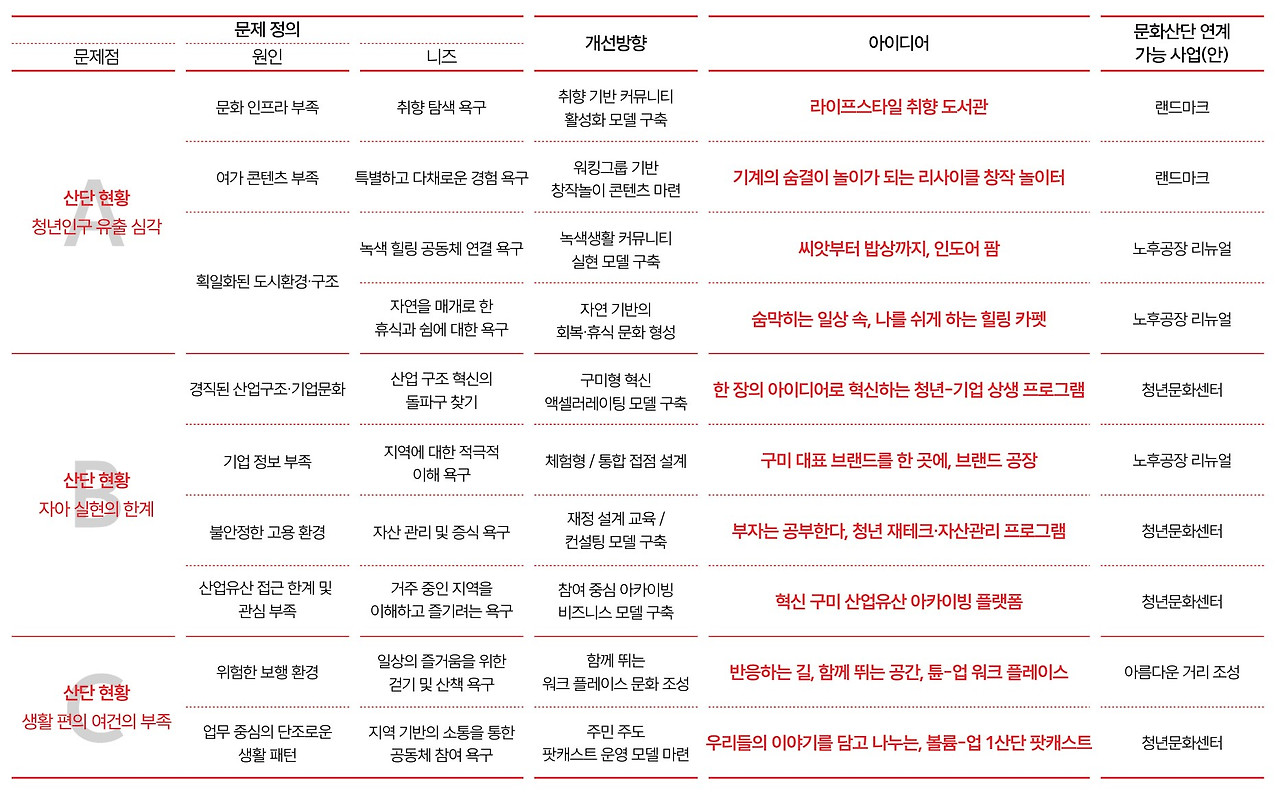 구미 산단의 발표는 대한민국 1호 국가산단이라는 자부심과 그 이면에 가려진 청년들의 고단함을 동시에 비췄다. 디자인선 이장우 대표는 구미의 청년들을 ‘옵티미디언(Optimist+Median)’이라 정의하며 이렇게 설명했다. “새우잠을 자면서도 고래꿈을 꾸는 사람들”. 현실은 녹록지 않지만, 지혜롭게 자기계발과 여가를 병행하며 고래 같은 꿈을 꾸는 이들이다. 구미가 던진 질문은, "청년이 떠나는 이유는 문화가 없어서인가, 아니면 삶을 확장할 경로가 없어서일까"였다. ‘인도어팜’, ‘브랜드 공장’, ‘라이프스타일 도서관’ 같은 아이디어는 문화시설 제안이라기보다, 청년의 일상과 산업을 어떻게 다시 연결할 것인가에 대한 제안이었다.