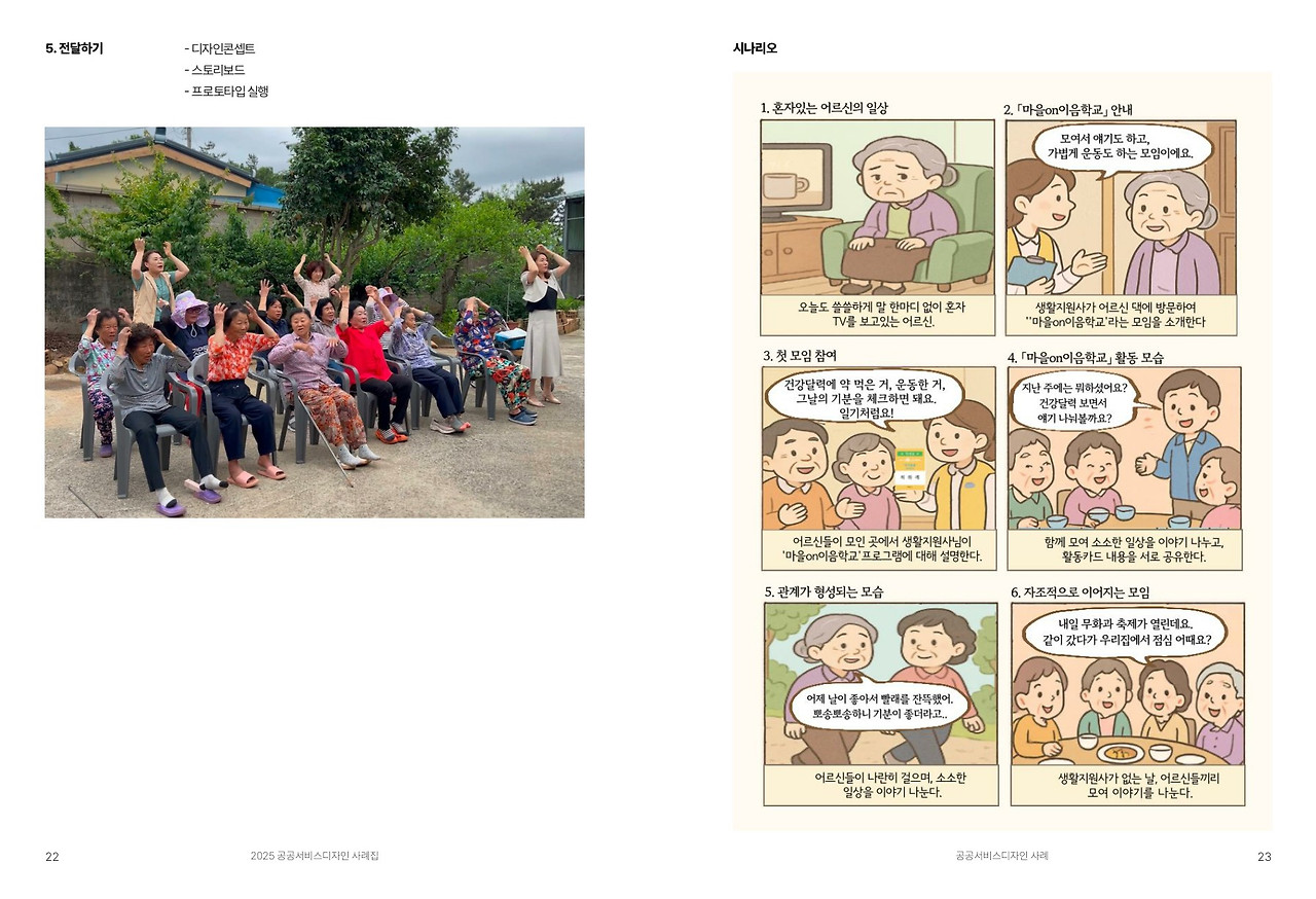 기존에는 생활지도사의 1대1 접촉 기반의 복지 제공으로 관계 형성에 한계. 거동 불편 고령자의 사회적 교류가 거의 이루어지지 않았다. 어르신들의 가장 큰 문제는 ‘정서적 고립’임을 발견하고 단순 안부 확인이나 물품 지원 등 지자체의 일방향 복지 제공에서 벗어나, 주민끼리 서로 돌보며 교류를 확대할 수 있는 자조 돌봄 프로그램 ‘마을on이음학교’를 기획하게 된다.