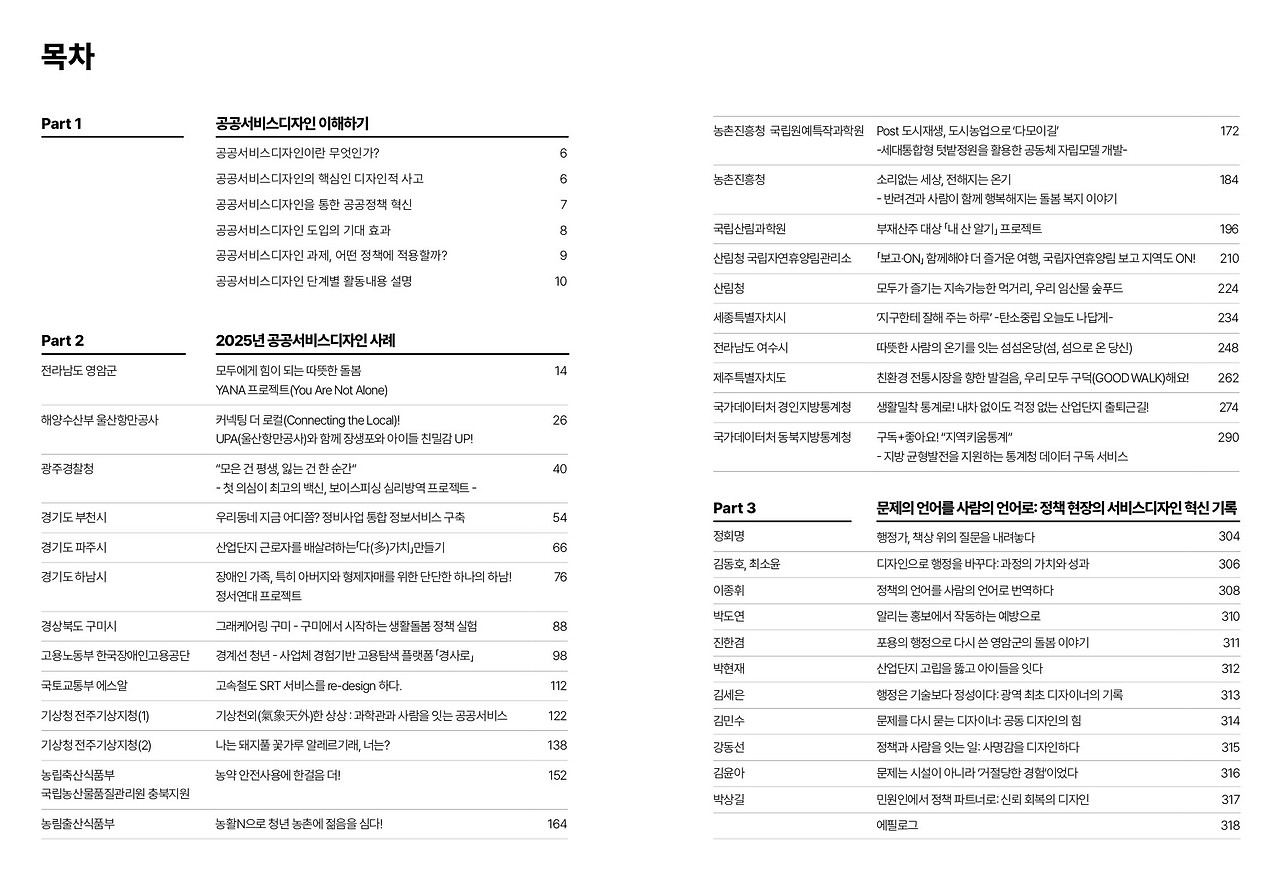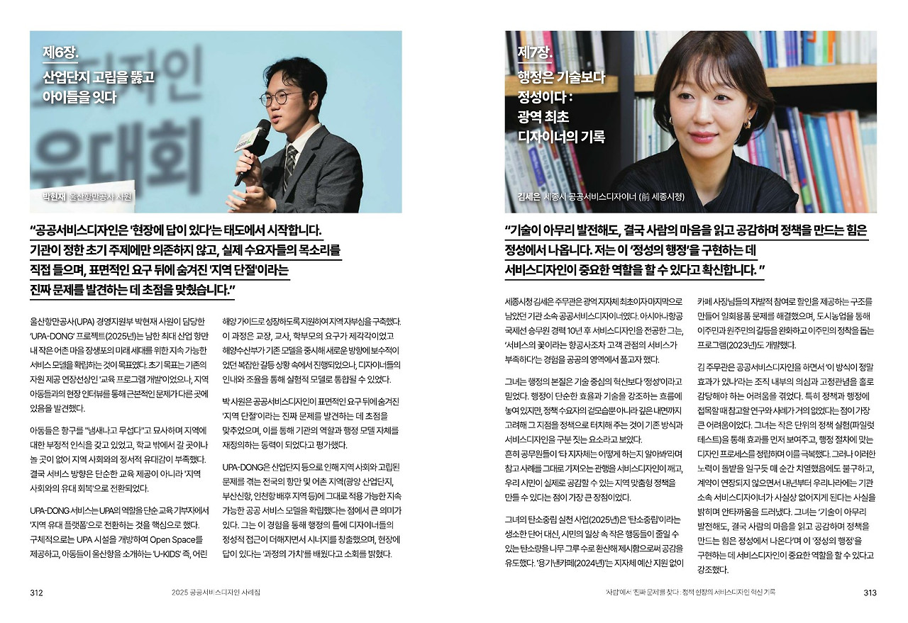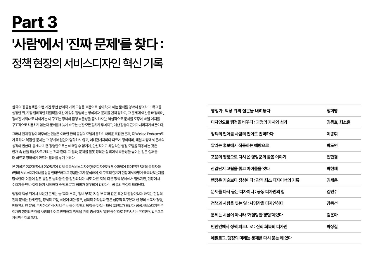 이번 사례집의 백미이다. 공공서비스디자인을 직접 경험한 11인의 행정가와 디자이너의 심층 기록을 담았다.