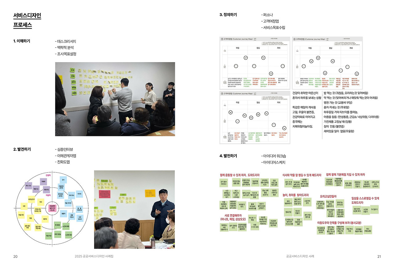 2025 공공서비스디자인 성과사례집에는 2025년 공공서비스디자인 우수 과제 23건과 함께, 사업을 수행한 공무원과 서비스디자이너 11명의 심층 인터뷰 수록되어 있다. 사례집에서는 2025년 진행된 공공서비스디자인 과제 중 수상작들이 현장에서 어떻게 개발되었고, 어떤 변화를 만들고 있는지 제시하고 있다.